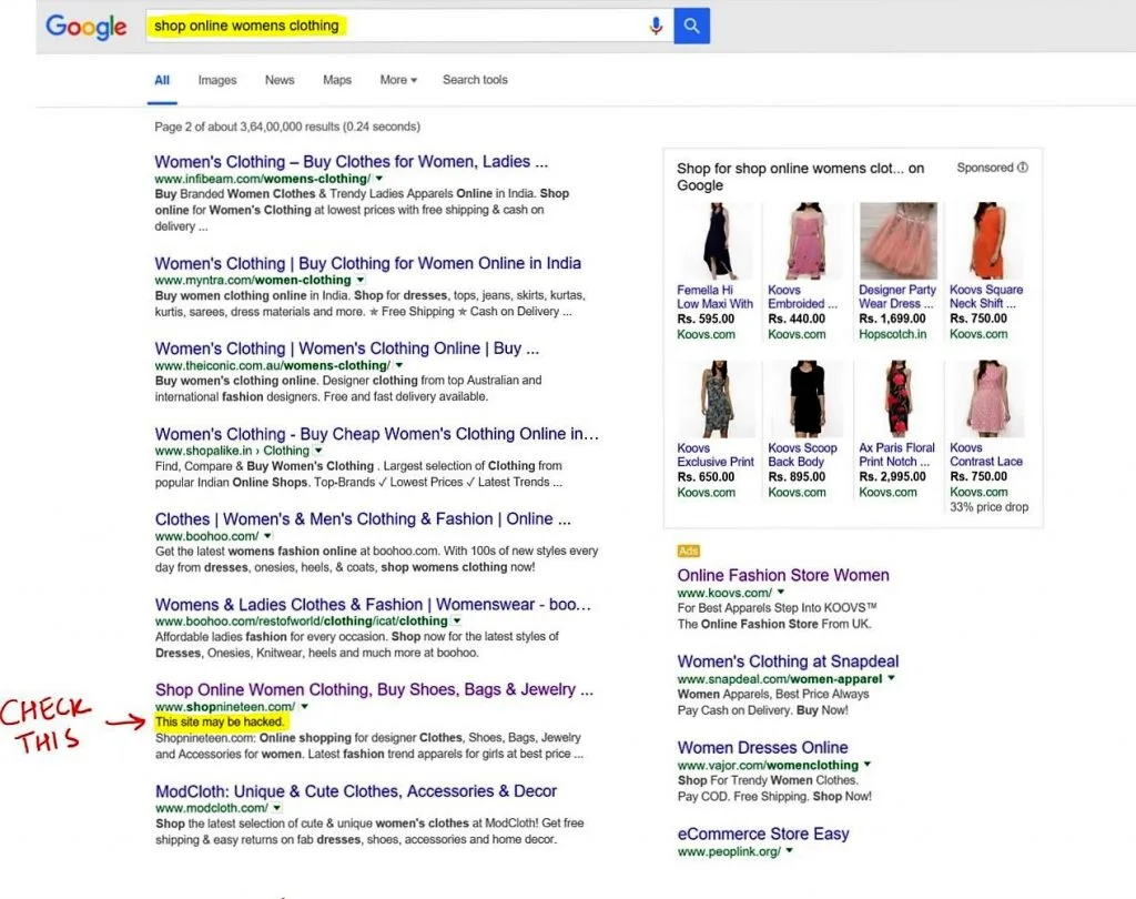 It was one of our usual days. One of our team members (who likes online shopping) was searching on Google and came across an E-commerce store for which Google was showing a catastrophic message – “This site may be hacked.”