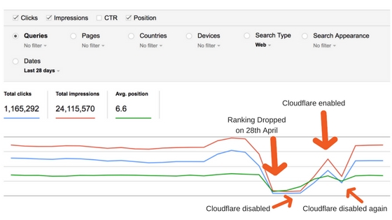After hours of brainstorming sessions with the client and his team, we had almost thought of succumbing to the situation. Fortunately, we came across a few posts that hinted at Cloudflare being the culprit for SEO ranking drop: